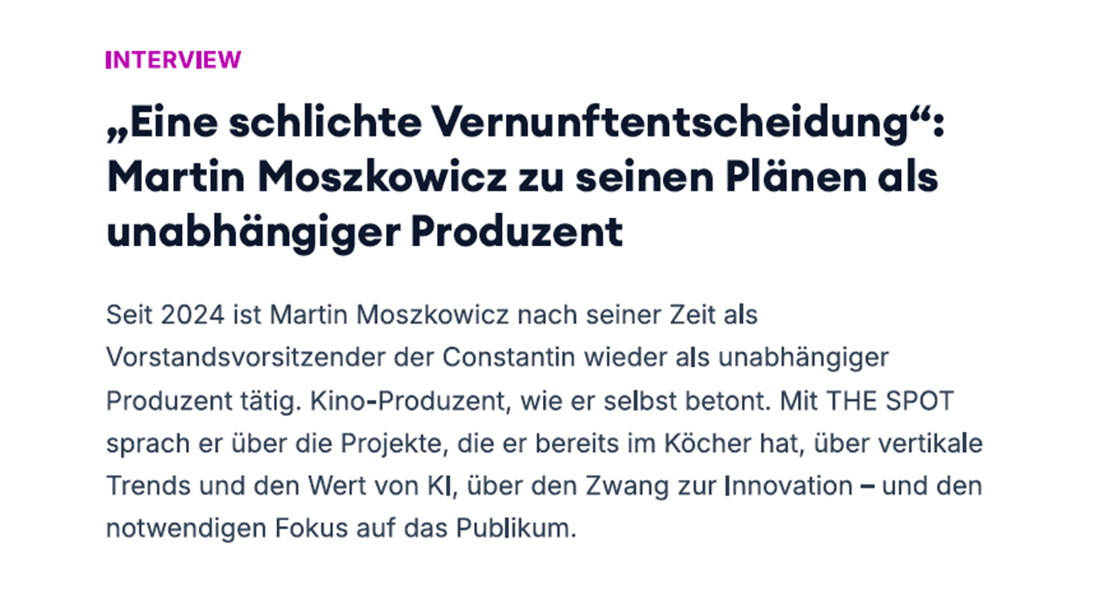 Seit 2024 ist Martin Moszkowicz nach seiner Zeit als Vorstandsvorsitzender der Constantin wieder als unabhängiger Produzent tätig. Kino-Produzent, wie er selbst betont. Mit THE SPOT sprach er über die Projekte, die er bereits im Köcher hat, über vertikale Trends und den Wert von KI, über den Zwang zur Innovation – und den notwendigen Fokus auf das Publikum.